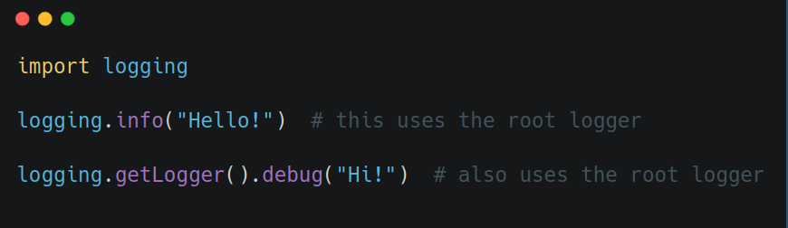 This hierarchy is useful because it lets you enable or disable logging for entire layers of your application. In practice, though, you rarely need to build this whole tree from scratch. The root logger does a good job on its own. Nevertheless, you should often times avoid using it directly (more on that below).