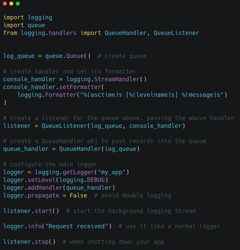 Building the log record isn't the slow part; sending it where it needs to go, is. Essentially, the I/O part. And a queue handler stores the log records in a queue without blocking, while an associated queue listener reads those messages and passes them to a handler in another thread. That way, the main thread can keep running while logs are flushed asynchronously.