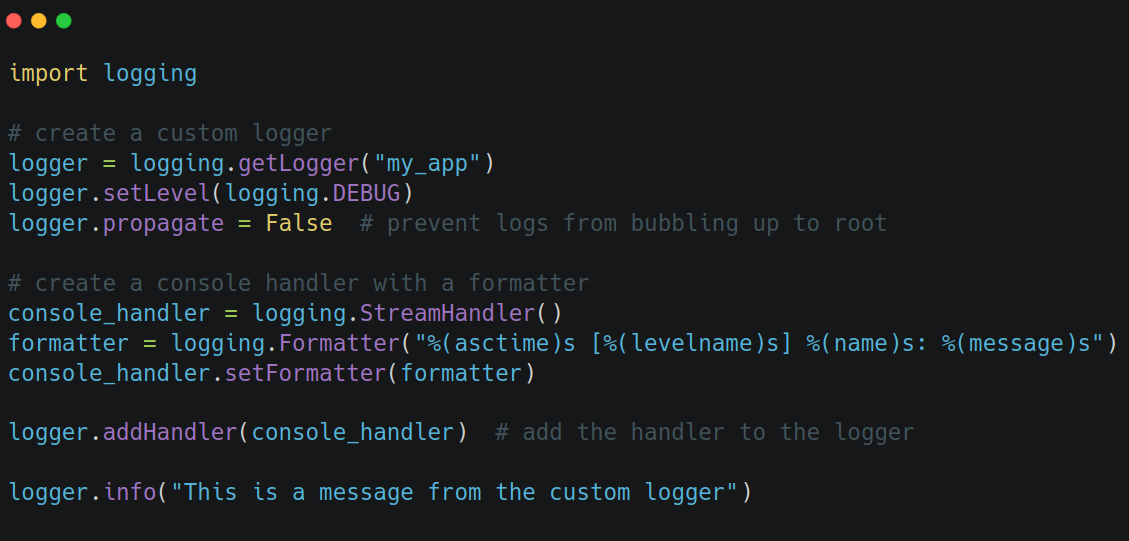 That being said, for reasons explained in the sections above, in larger applications it's better to create a dedicated logger for your application, attach handlers, and control propagation explicitly: