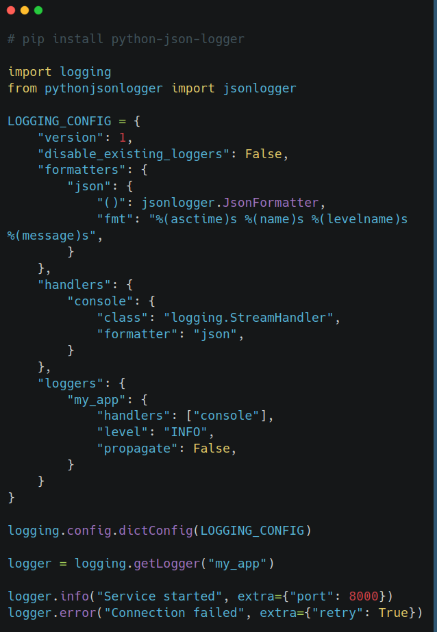 {"timestamp": "2025-11-09T12:00:01Z", "level": "DEBUG", "name": "my_app", "message": "Listening on port 8000"}