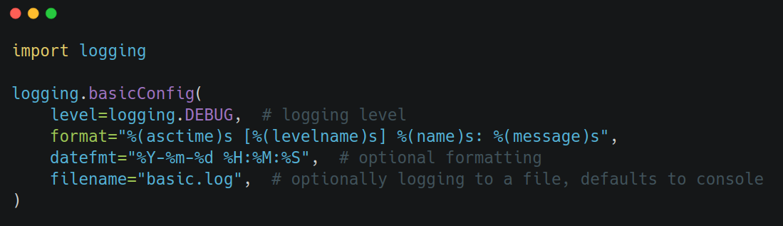 For small applications or quick prototypes, you can configure logging easily using basicConfig(). This sets up the root logger with default handlers, level, and formatting.